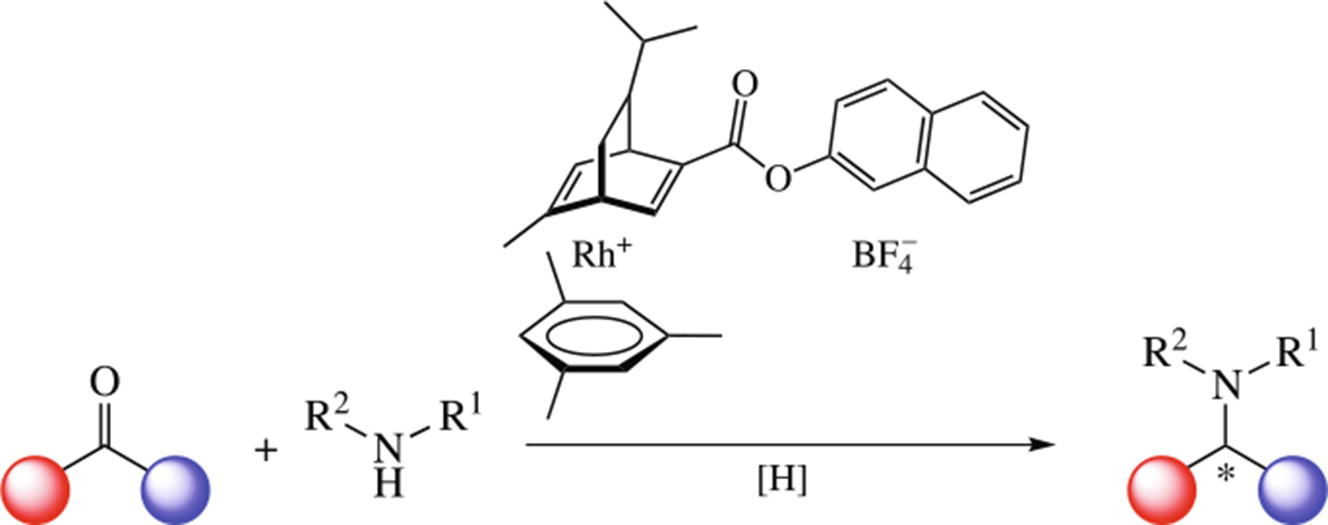 The CO- and H2-assisted reductive amination of carbonyl compounds catalyzed by stable chiral Hayashi ligand-based rhodium complex afforded the racemic amines in moderate yields. The racemic outcome of the process results from the elimination of the chiral ligand from the catalyst under the action of hydrogen or carbon monoxide as reductants.