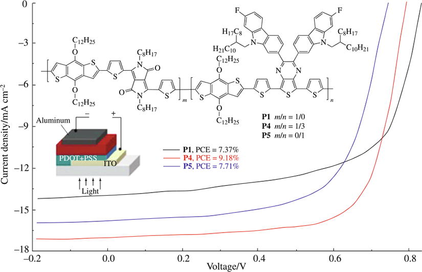 New random ternary copolymers containing fragments of pyrrolo[3,4-c]pyrrole-1,4-dione, 2,3-bis[6-fluoro-9-(2-octyl- dodecyl)-9H-carbazol-3-yl]-3,3′-[5,7-di(thiophen-2-yl)- thieno[3,4-b]pyrazine as electron-withdrawing fragments and benzodithiophene as an electron-donor block have been synthesized. The best power conversion efficiency of 9.18% was achieved for the terpolymer with pyrrolopyrroledione/ thienopyrazine ratio of 1:3. The introduction of the third thieno[3,4-b]pyrazine acceptor block into the structure of the ‘parent’ binary polymer can significantly adjust energy levels and the light absorption range of irregular copolymers, and can enhance photovoltaic properties due to improved absorption capacity and charge transfer.