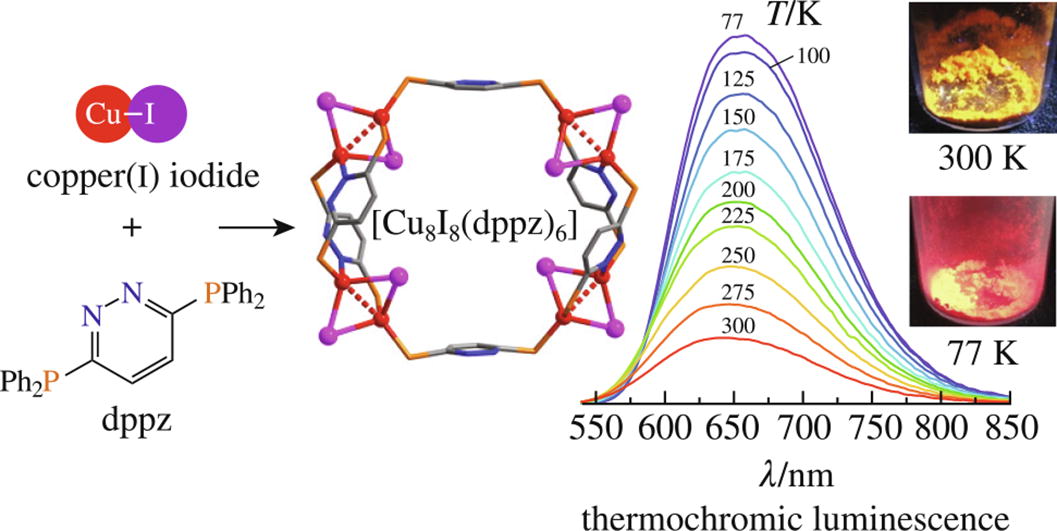 The reaction of CuI and 3,6-bis(diphenylphosphino)pyridazine (dppz) in MeCN leads to the wheel-shaped complex [Cu8I8(dppz)6], assembled from four [Cu2I2] units and six dppz ligands. This complex exhibits thermochromic luminescence with emission colors ranging from red (300 K) to deep red (77 K). When carried out in the presence of PPh3, the reaction of CuI with dppz gives a non-emissive cage-like complex [Cu2I2(dppz)3], in which two CuI units are P,P′-bridged by three dppz ligands.