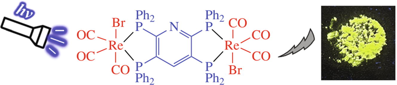 The reaction of 1,2,4,5-tetrakis(diphenylphosphino)pyridine (L) with Re(CO)5Br (in a molar ratio of 1:2) leads to the bis-chelated complex [Re2(CO)6(L)Br2] in 95% yield. At ambient temperature, the solid complex exhibits green phosphorescence (λmax = 535 nm) with a quantum yield of 12% and a lifetime of 90 μs.