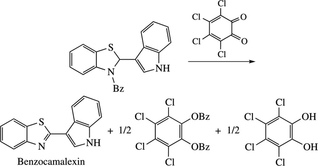 The study of oxidation step in the preparation of benzocamalexin by the α-amidoalkylation–oxidation sequence revealed the formation of perchloro-1,2-phenylene dibenzoate as the product of transformation of tetrachloro- 1,2-benzoquinone applied as the oxidant. The structures of benzocamalexin and perchloro-1,2-phenylene dibenzoate were confirmed by X-ray diffraction analysis. The extraction step in the final isolation of benzocamalexin is supposed to be crucial for the complete transformation of mono- and di- acylated perchloropyrocatechol.