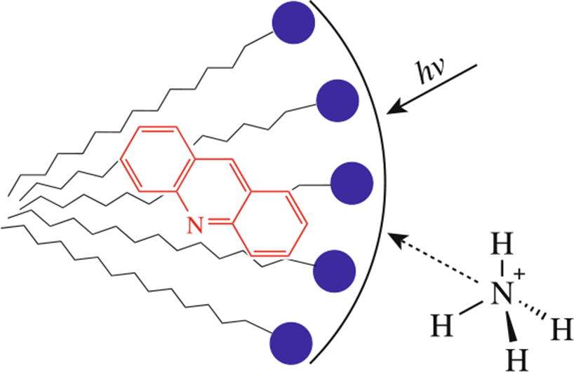 The effect of anionic, nonionic and cationic surfactants on the protonation reaction of acridine in an excited state has been studied. In the case of sodium decyl sulfate and sodium dodecyl sulfate, the observed shift in pK * to a more alkaline region was +0.6 and +0.9 units (from 9.9 to 10.5 and 10.8 respectively), which corresponds to a decrease in the Gibbs free energy by 3.5 and 5.0 kJ mol–1.