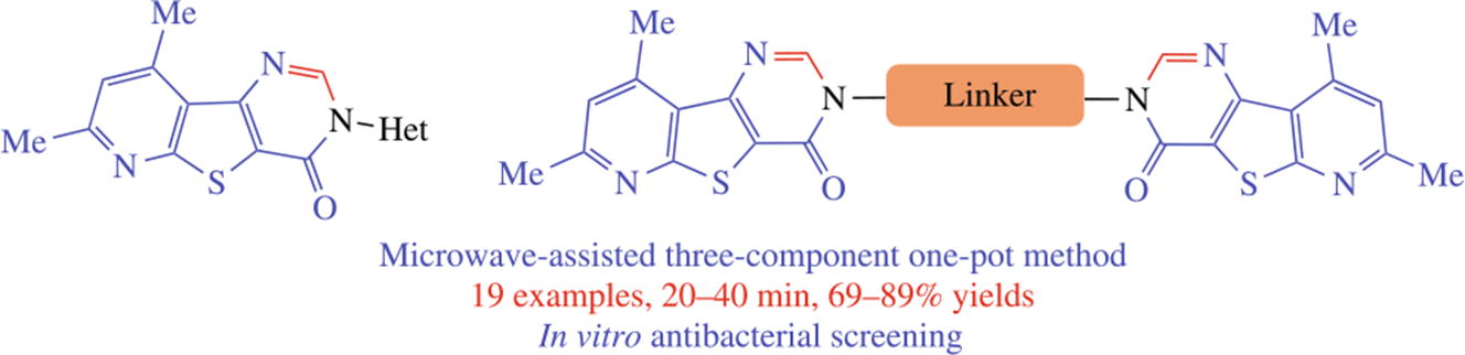 A three-component protocol involving the reaction of 3-aminothieno[2,3-b]pyridine-2-carboxylate, Me2NCH(OMe)2 and heteroaryl (bis)amines in dioxane under microwave irradiation yielded a new series of pyrimidinones. The target hybrids were formed by an initial formamidine formation,Pyrazole-linked pyrimidinones displayed the best antibacterial activity against all the gram-positive and negative strains tested.