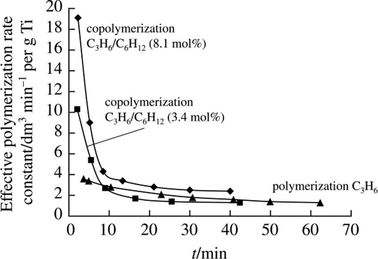 The polymerization of propylene with small amounts of 1-hexene in the presence of supported titanium–magnesium catalyst containing two internal non-phthalate donors was accomplished. Polypropylene modification with small amounts of 1-hexene affects the thermophysical properties and molecular weight characteristics of the polymers. The activation mechanism of the reaction is described; the introduction of small amounts of 1-hexene causes an increase in activity by a factor of 1.5.