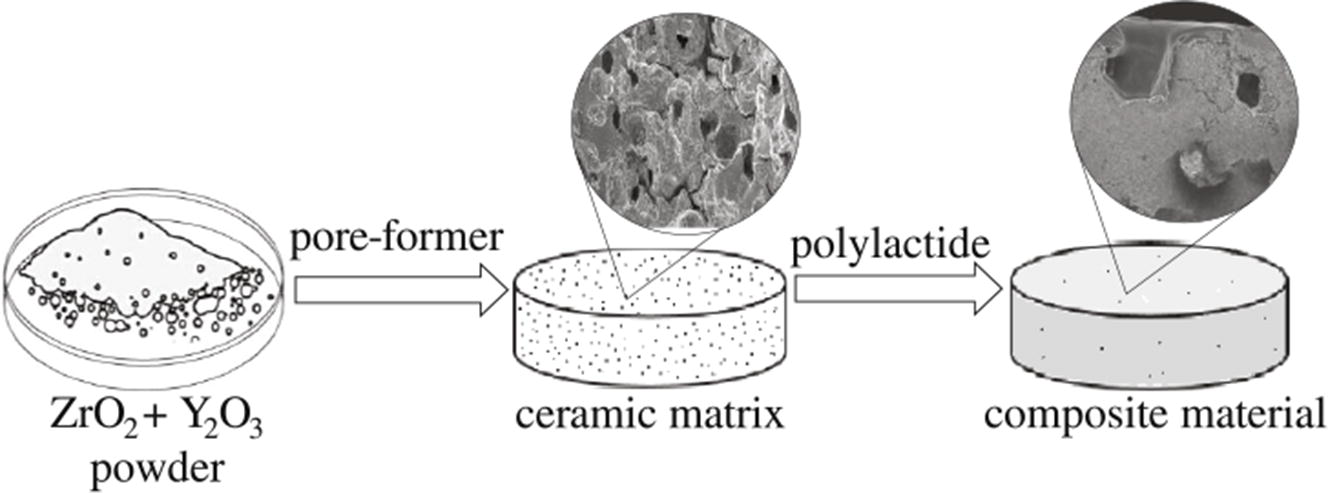 The dependence of the porosity, mechanical and surface properties of the obtained zirconium ceramics on the content of polylactide as a pore-forming agent was explored. It was shown that modification of ceramics with the polymer material leads to the improvement of mechanical properties and to the decrease in the cytotoxicity of materials.