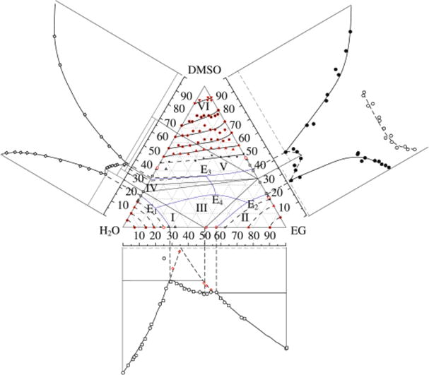 The ternary system water–ethylene glycol–dimethyl sulfoxide (H2O–EG–DMSO) was investigated by differential scanning calorimetry in the temperature range of 188–298 K. In the concentration range from ∼10 to ∼50 mol% DMSO, crystallization or glass formation are not observed when the temperature is lowered to 188 K. Significant supercooling of the solution in this composition range is explained by the existence of spatial networks of H2O and EG.