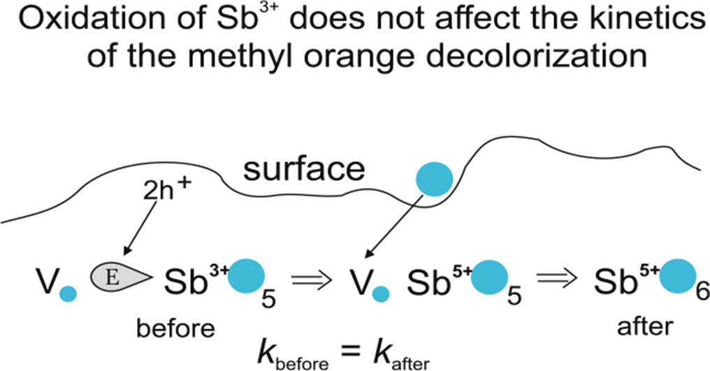 Ultraviolet photocatalytic experiments on the kinetics of decolorization of methyl orange and the 121Sb Mössbauer characterization of the title catalyst were performed. The stereochemically active electronic lone pair of Sb3+ was found to completely deactivate the neighboring oxygen vacancy as a recombination center towards the photogenerated electrons and holes.