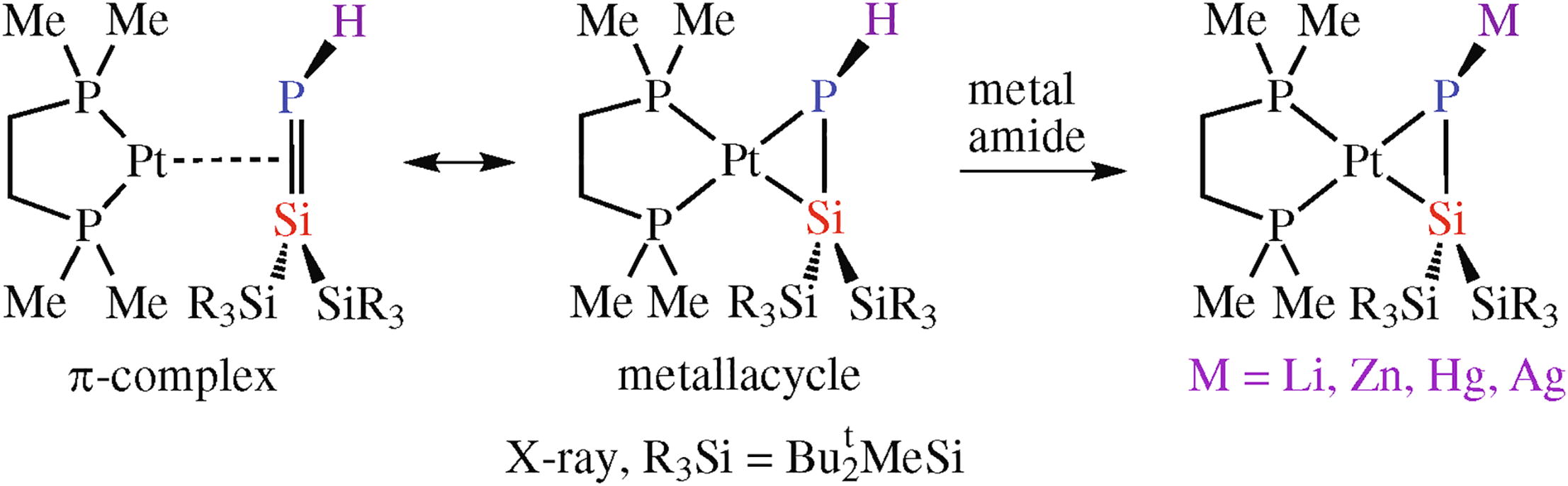 Compound η2-((R3Si)2Si=PH)–Pt(dmpe) was synthesized by trapping the transient phosphasilene, (R3Si)2Si=PH. Novel hetero-bi- and tri-metallic complexes derived from η2-((R3Si)2Si=PH)–Pt(dmpe) containing Pt with Li, Zn, Hg and Ag metals were synthesized and characterized by multi- nuclear NMR spectroscopy and X-ray crystallography. The synthesis of η2-((R3Si)2Si=PH)–Pt(dmpe), and its bonding character are discussed; a 1,2-silyl shift from silicon to phosphorus (a ‘Brook-type’ rearrangement) within the coordination sphere of a Pt complex is also reported.