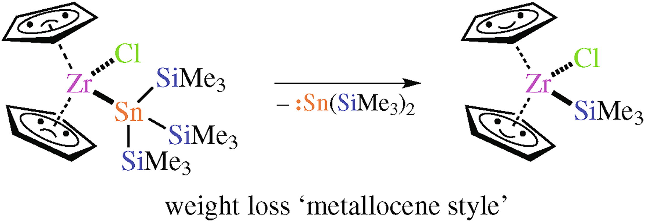 Reactions of (Me3Si)3SnK with Cp2MCl2 (M = Zr, Hf) give the respective stannylated metallocene chlorides. These complexes display a tendency to eliminate bis(trimethylsilyl)-stannylene under Cp2M(Cl)SiMe3 formation.