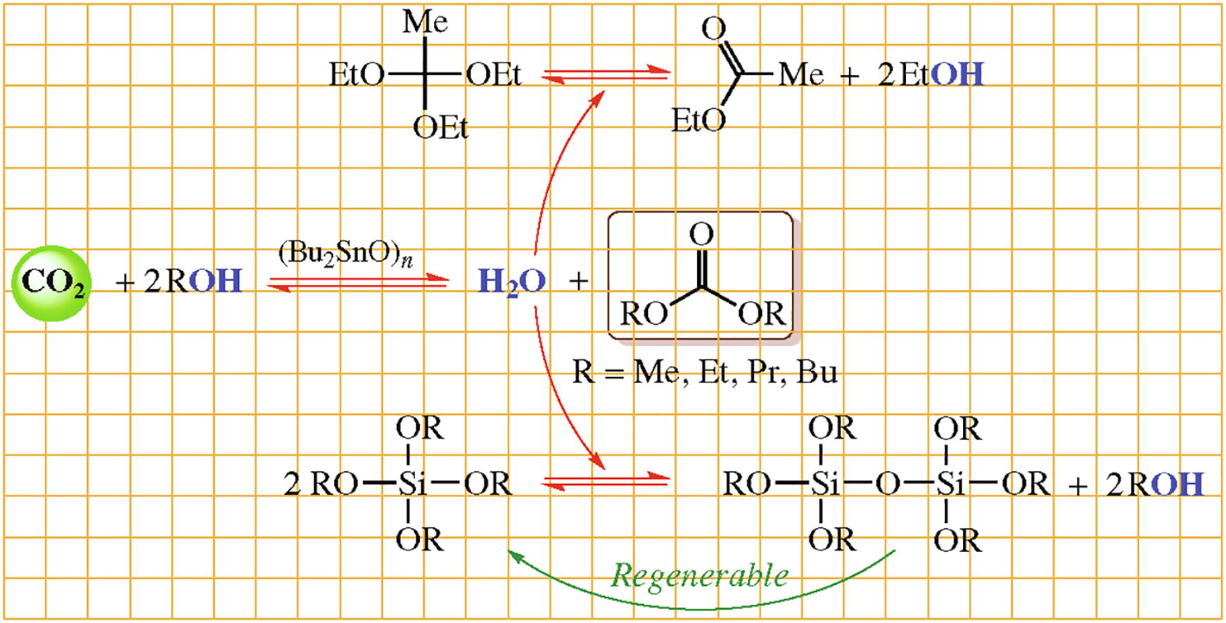The combination of a dibutyltin(IV) oxide catalyst with an ortho ester as the dehydrating agent exhibited high activity for the direct synthesis of diethyl carbonate from CO2 and ethanol in 78% yield. With water as a by-product limiting the reaction, a recoverable dehydrating agent is required. When alkoxysilanes were employed for this purpose, various dialkyl carbonates were obtained in yields of 33–45%.