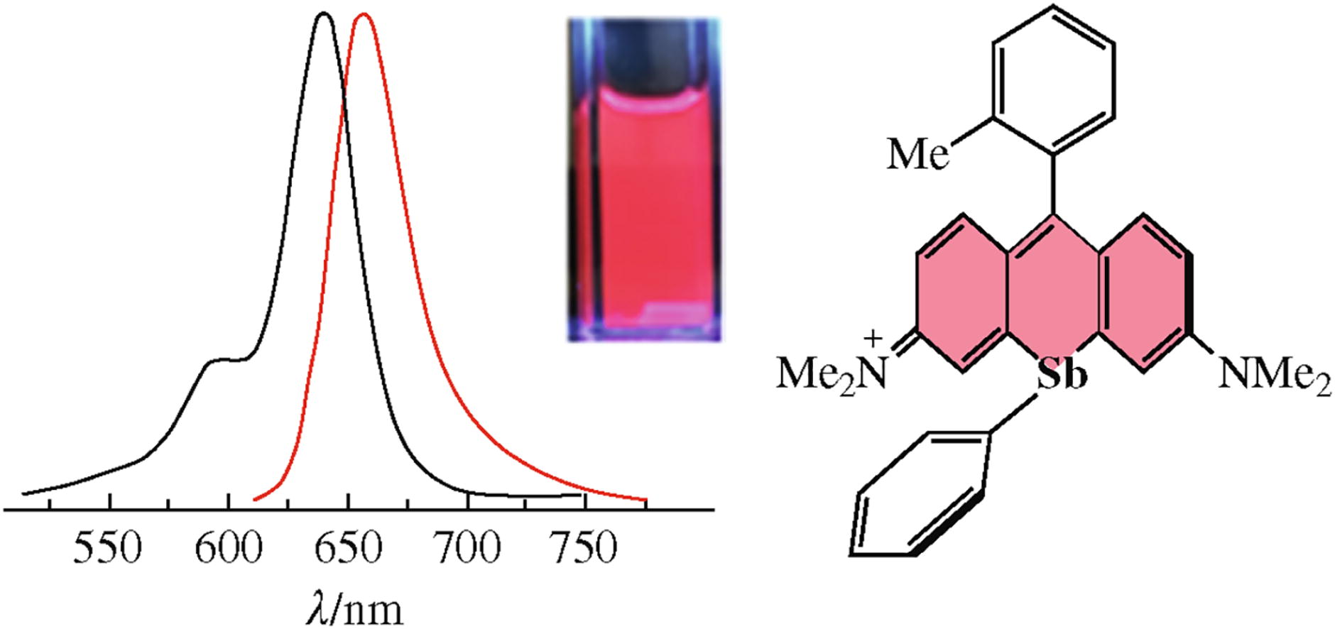 We describe the synthesis, structure and characterization of an antimony-rhodamine derivative with a phenyl-antimony moiety installed at the 10' position of the central ring. This compound is a red fluorophore (λem = 655 nm) with a quantum yield of 12% in acetonitrile.