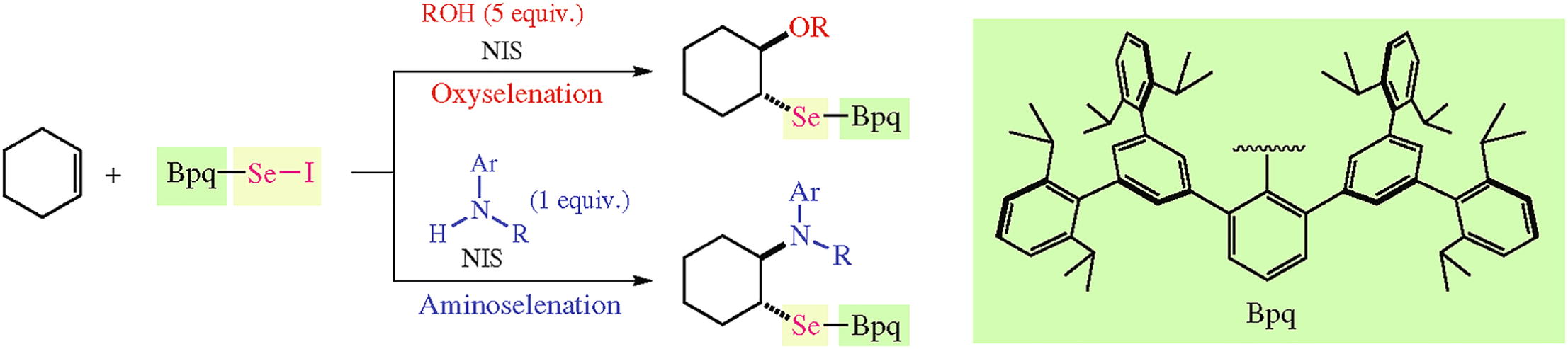 Application of an isolable selenenyl iodide BpqSeI (Bpq denotes 5',5'''-bis(2,6-diisopropylphenyl)-2,6,2'''',6''''-tetra-isopropyl-1,1':3',1'':3'',1''':3''',1''''-quinquephenyl-2''-yl) to selenofunctionalization of alkenes with external oxygen or nitrogen nucleophiles was investigated. In the presence of N-iodosuccinimide as an additive, alcohols, a carboxylic acid, or aromatic amines were smoothly introduced to alkenes to give the corresponding β-oxy or β-amino selenides in moderate to high yields.