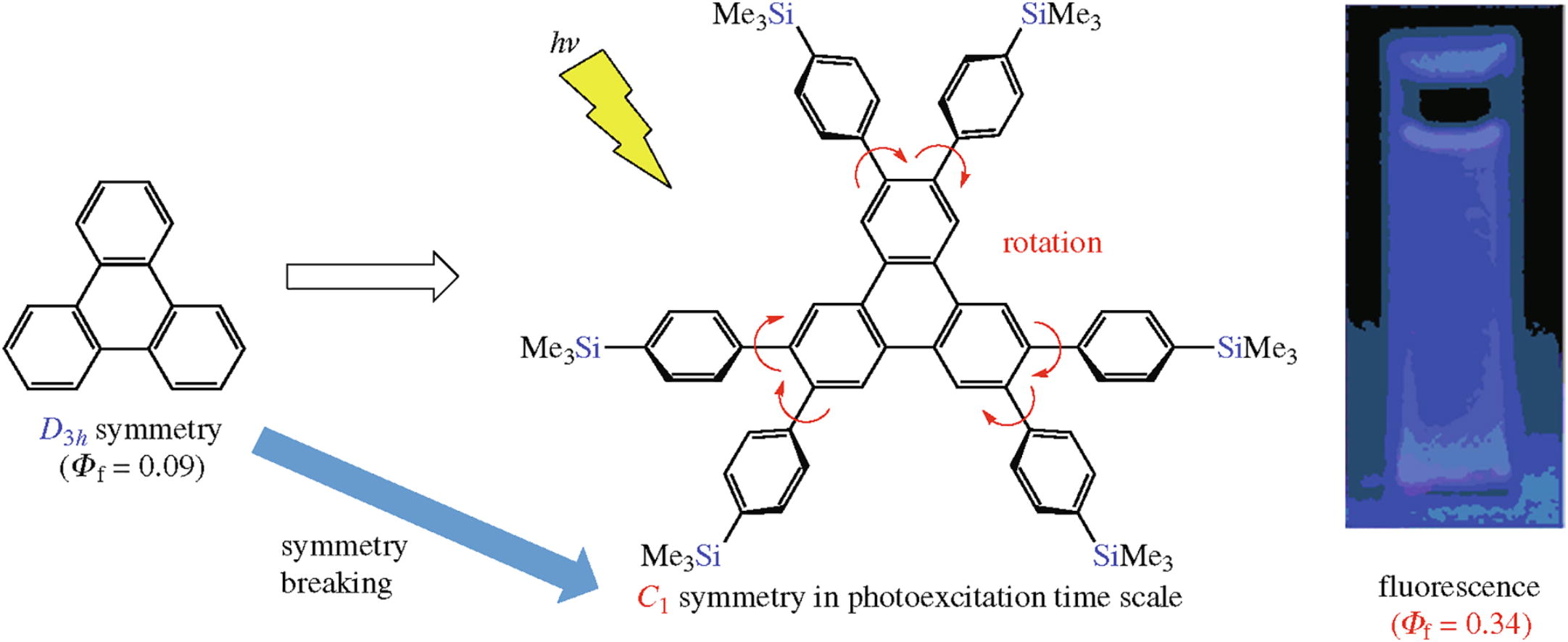 The fluorescence quantum yield of triphenylene is low because the transition moment between the HOMOs and the LUMOs is negligibly small. To improve the fluorescence quantum yield, break of the symmetrical structure of triphenylene is necessary. We found that the rotational effect of the 4-(trimethylsilyl)phenyl groups of 2,3,6,7,10,11-hexakis[4-(trimethylsilyl)phenyl]triphenylene is effective to break the symmetry in spite of the symmetrical structure, leading to improvement of the fluorescence quantum yield.