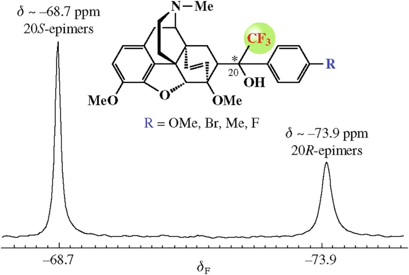 21,21,21-Trifluoro(aryl)thevinols were synthesized by the reaction of 21,21,21-trifluorothevinone with aryl Grignard reagents. The absolute configuration at C20 atom in these CF3-substituted alcohols can be easily determined by one-dimensional 19F NMR spectroscopy that was verified by X-ray diffraction studies.