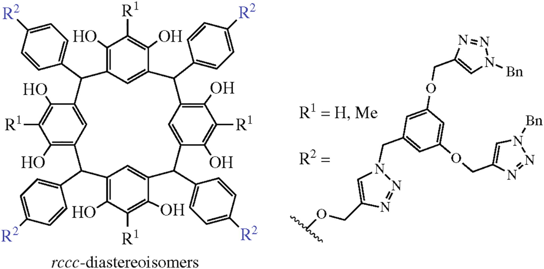 Novel first-generation dendrimers on the calix[4]resorcinol core with four branches each containing multiple 1,2,3-triazole units have been synthesized in one-step by acid catalyzed condensation of resorcinols with a new aldehyde dendron, namely, 4-{3,5-bis[(1-benzyl-1H-1,2,3-triazol-4-yl)- methoxy]benzyloxy}benzaldehyde (obtained by alkyne–azide cycloaddition). The reaction proceeds stereoselectively to form rccc-diastereoisomers in high yields.