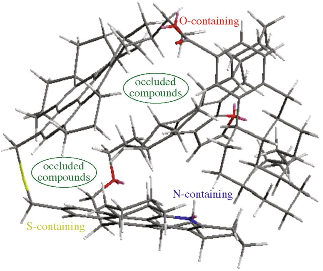 Ruthenium ion-catalyzed oxidation of methanonaphthene oil (Krapivinskoye oilfield) revealed that its high molecular asphaltenes contain aromatic–aliphatic bridges and non- covalently bound (occluded) compounds. Covalently bound fragments are represented by C5–C18 n-alkanes, aromatic biphenyl-type structures, and naphthalenes located in the peripheral part of asphaltene molecules. Typical biological markers, i.e. terpanes, steranes, and n-alkanes have been identified among the occluded compounds.