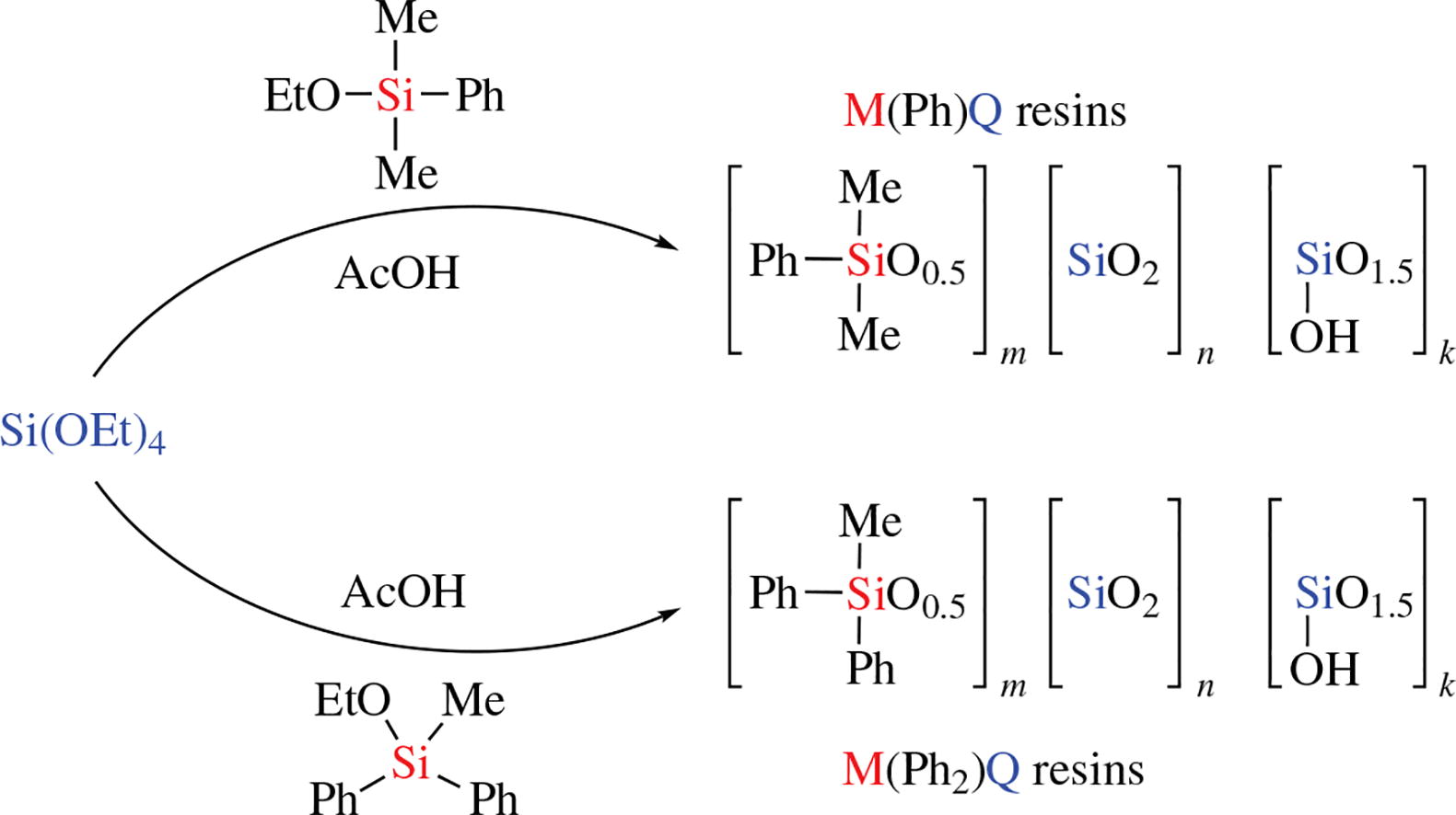 MQ resins have been prepared in acetic acid as an active medium from dimethylphenyl- or methyldiphenylethoxy-silane as the M-components and tetraethoxysilane as the Q-component. All prepared samples with M/Q ratios of 1:1, 1:1.5, 1:2, 1:3, and 1:4 were well soluble in organic solvents like toluene and THF. Compared to MQ resins with trimethylsilyl group as the M-component, the new MQ resins with phenyl substituents may possess improved compatibility to thermoplastic polymers, rubbers and coating formulations.