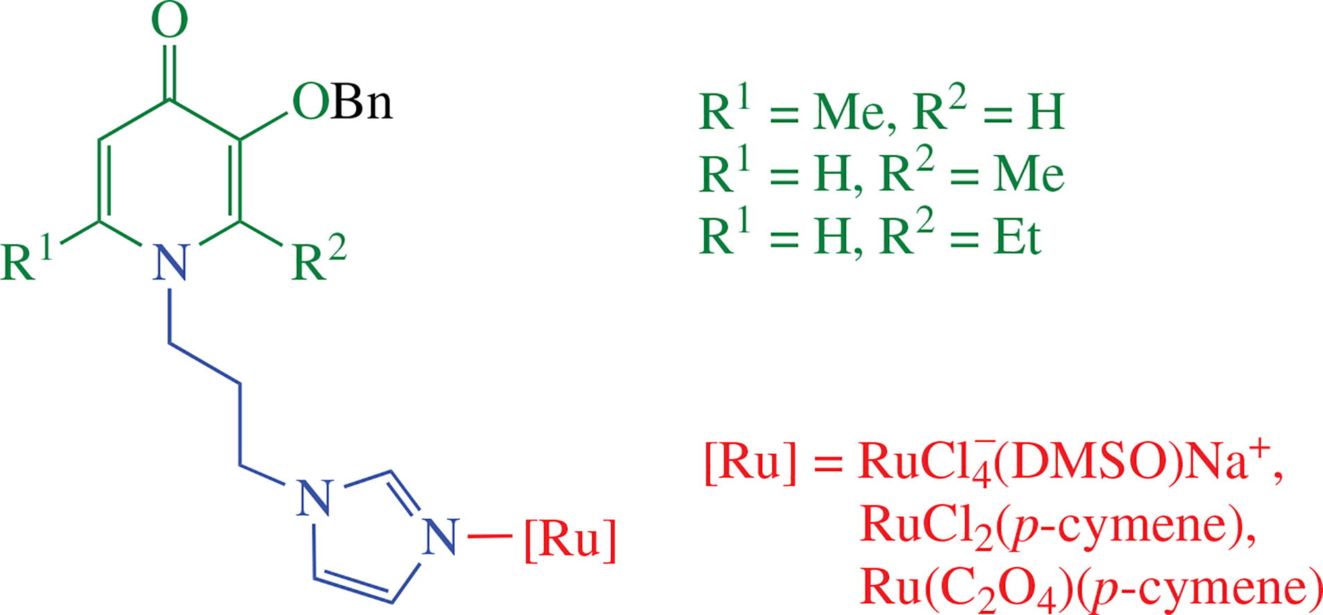 Preparation of novel imidazole ligands containing 3-(benzyloxy)pyridinone moiety is described. The Ruiii and Ruii leader-compounds containing the above-mentioned ligands were synthesized by coordination of imidazole group. The stability of the obtained compounds was explored in buffer solution and in the presence of DMSO, respectively, and their antiproliferative activity was assessed.