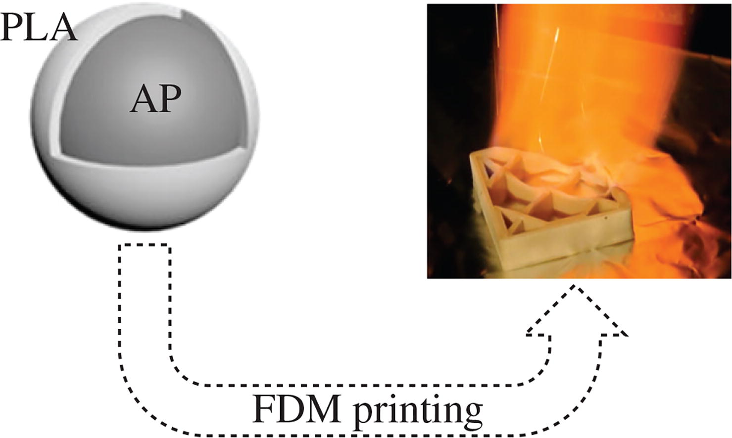 For the first time, complex geometry combustible structures of an ammonium perchlorate–polylactic acid composite have been successfully printed using fused deposition modeling (FDM). The structural and energetic capabilities of the printed structures are demonstrated. Combined with the ability to be produced by FDM printing, these combustible elements could afford many practical applications.