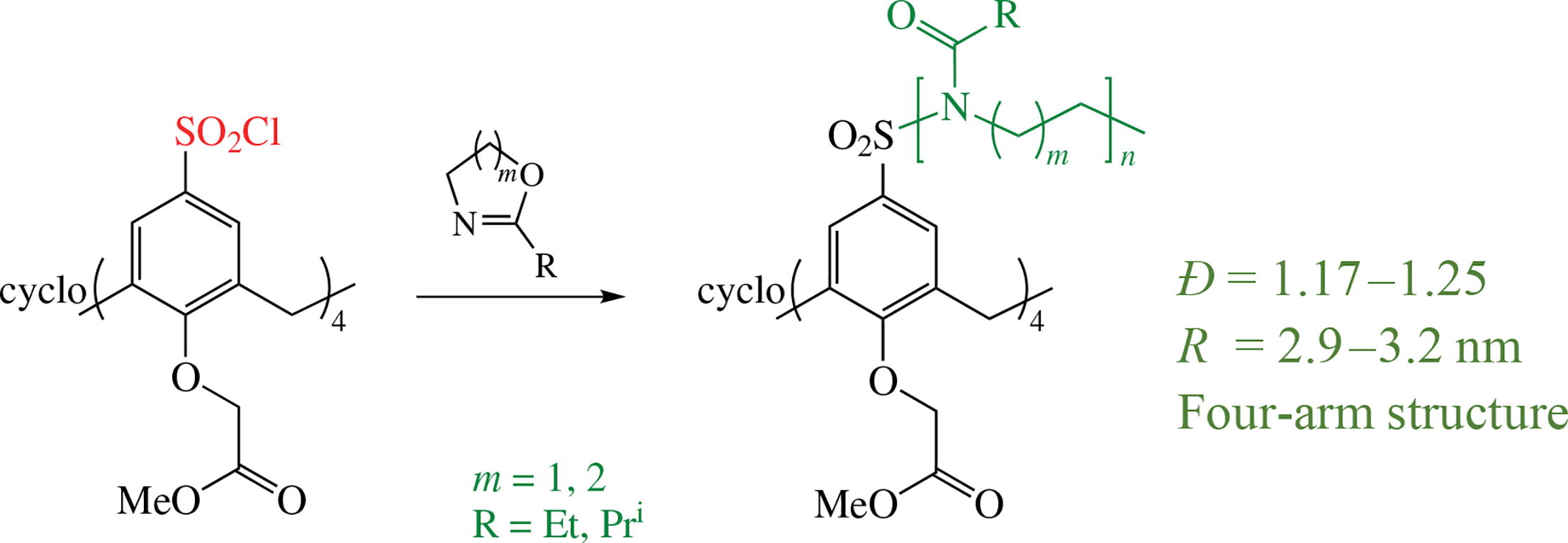 New four-arm star poly(2-alkyl-2-oxazolines) and poly(2-alkyl-2-oxazines) were synthesized using sulfochlorinated calix[4]arene derivative as a multifunctional initiator. Their characteristics were investigated by gel permeation chromatography, light scattering and viscometry. The polymer stars obtained were shown to have well-defined architecture and high intramolecular density.