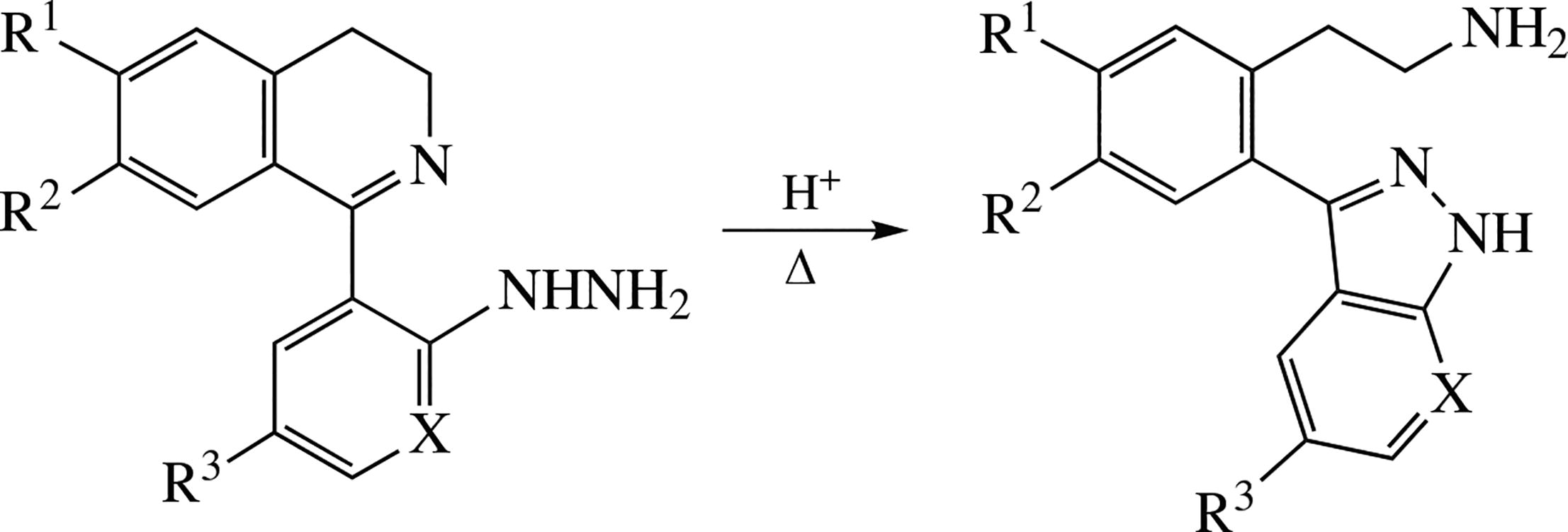 1-(2-Hydrazinoaryl)-3,4-dihydroisoquinolines and their hydrazinopyridyl analogues undergo recyclization affording novel (7-aza)indazolyl-β-arylethylamines. The products are expected to possess neurotropic activities.