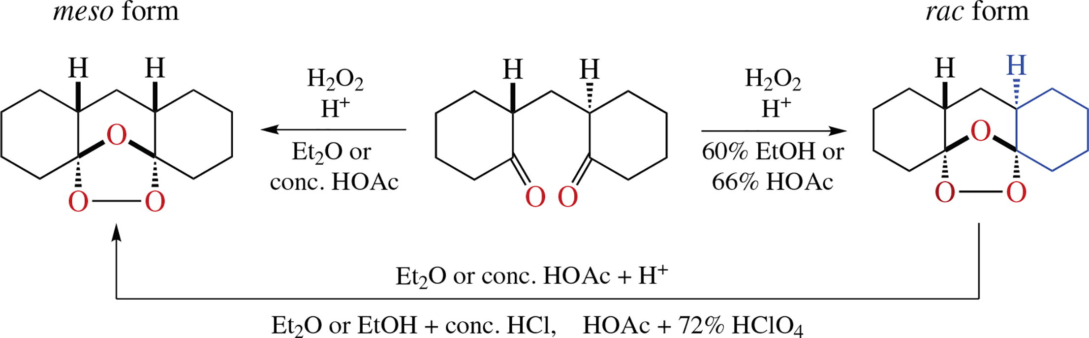 The conditions and reasons for the stereoselective transformation of the rac form of 2,2′-(methylene)-dicyclohexanone into the meso- or rac-diastereomer of tetracyclic dispiro ozonide (1,2,4-trioxolane) in the reaction with 30% aqueous H2O2 in the presence of acid have been determined. A mechanism for the stereoisomerization of ozonides was proposed, and the stereochemistry of diastereomeric ozonides was established by NMR data.