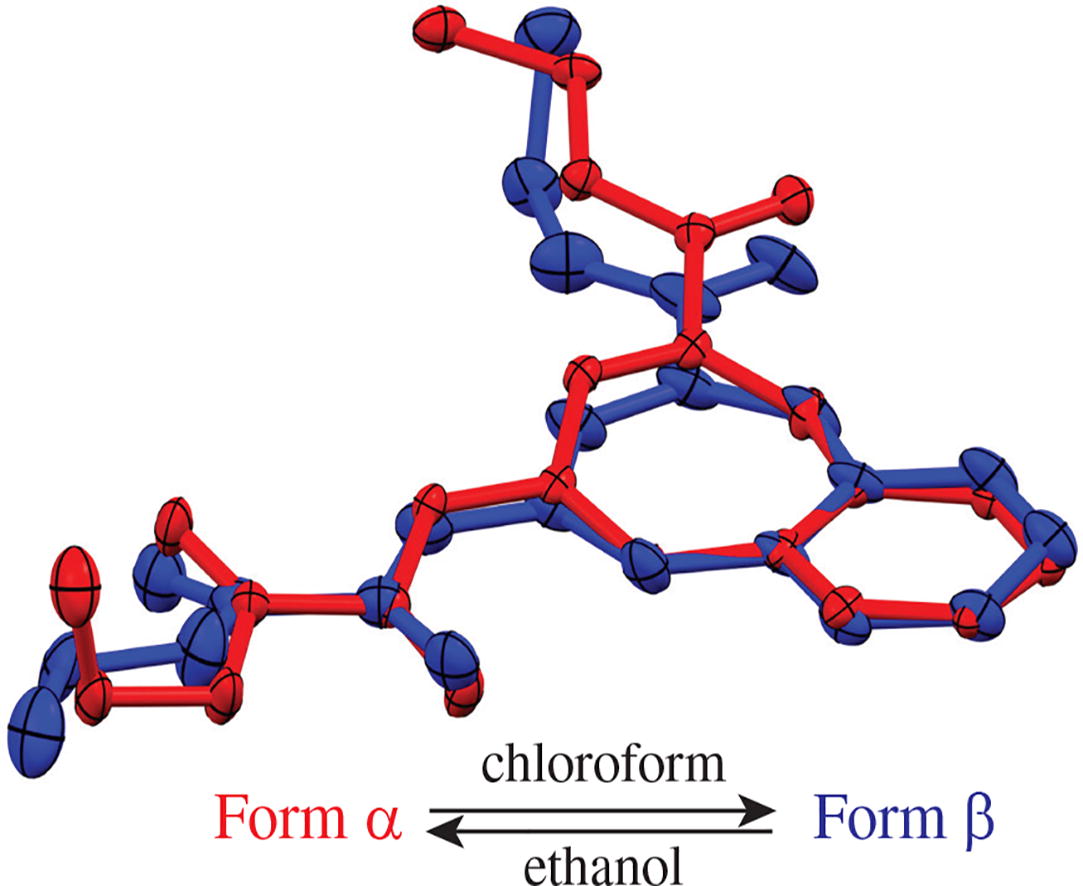Ethyl 4-[(Z)-3-ethoxy-2,3-dioxopropylidene]-4,5-dihydro-1H-benzo[b][1,4]diazepine-2-carboxylate forms two polymorphic modifications α and β, which differ in molecular conformations, as well as in the dimension of H-bonded supramolecular motifs in crystals that are a 1D chain or a 0D dimer, respectively. The formation of polymorphs can be controlled by choice of the solvent used. Crystallization from a solution in a polar protic solvent, ethanol, results in the thermodynamically favorable α-form, while using a low-polarity solvent, chloroform, and melt crystallization lead to the metastable β-form.