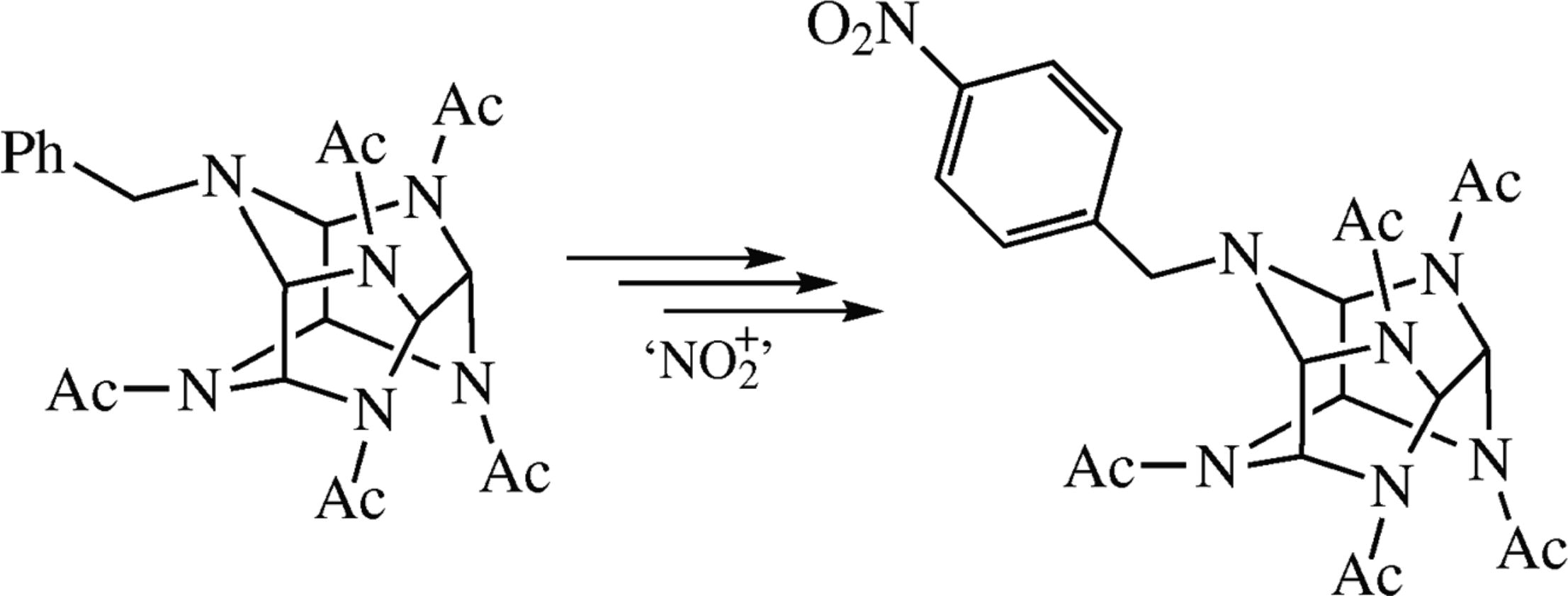 Nitration of N-benzylated 2,4,6,8,10,12-hexaazaisowurtzitane derivatives occurs selectively at para-positions of the benzyl groups. The best reagent for this reaction is ammonium nitrate in sulfuric acid.