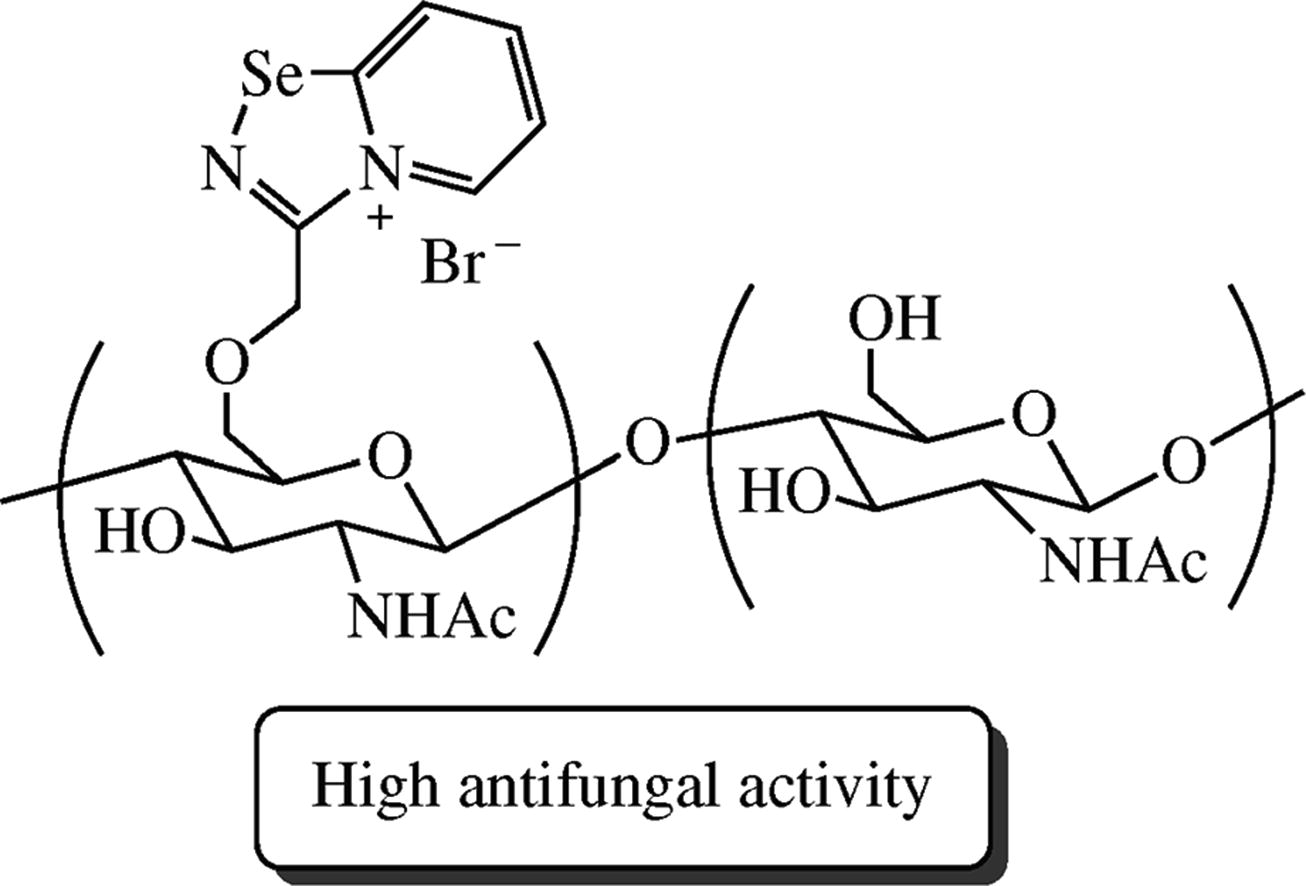 Mild and ‘green’ ultrasound-assisted reaction of chitin with 3-(chloromethyl)[1,2,4]selenadiazolo[4,5-a]pyridin-4-ium bromide in water affords novel selenium-containing cationic chitin derivatives. The thus obtained chitin derivatives are water soluble and are characterized by high in vitro antifungal activity comparable with conventional antifungal drug Amphotericin B.
