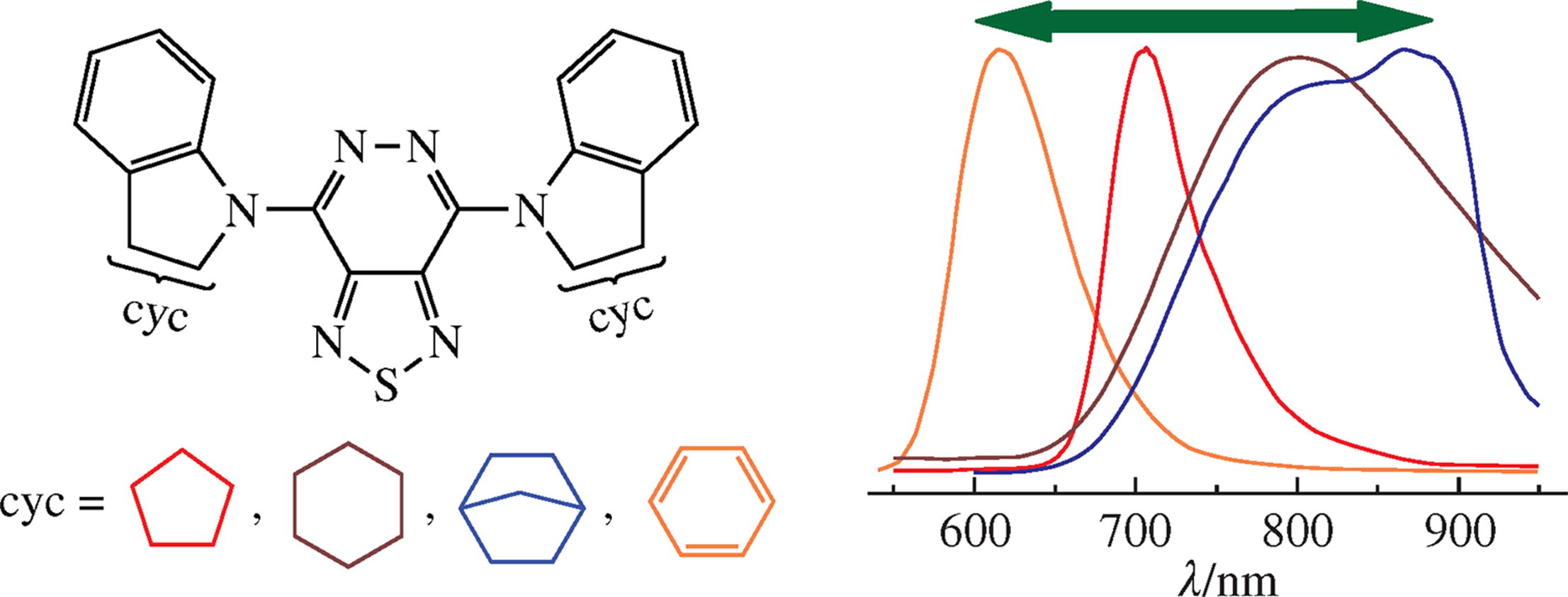 Three [1,2,5]thiadiazolo[3,4-d]pyridazines containing 4,7-positioned indole-type substituents were synthesized from the corresponding 4,7-dibromo precursor employing the SNAr aromatic nucleophilic substitution. Photophysical properties and DFT calculations showed that the D–A–D dyes based on [1,2,5]thiadiazolo[3,4-d]pyridazine core exhibited fluorescence in the near infrared region of the spectrum, which makes them promising for use as an active emitting layer in NIR-OLEDs as well as for other possible applications as an IR luminophore.