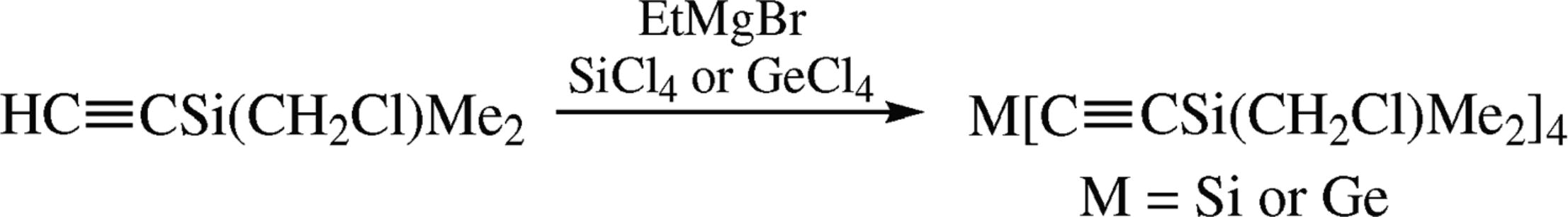 Tetrakis[(chloromethyl)dimethylsilylethynyl]silane and -germane were synthesized by the reaction of BrMgC≡CSi(CH2Cl)Me2 with SiCl4/GeCl4. Their structures were proved by IR, NMR spectroscopy and X-ray analysis, and compared to the results of MP2/6-311G(d,p) calculations.