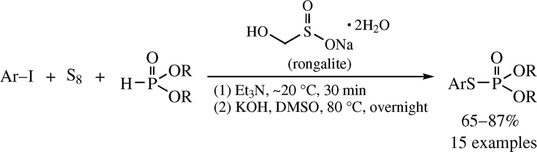 The improved procedure for the synthesis of S-aryl phosphorothioates from dialkyl phosphites (H-phosphonates), aryl iodides and elemental sulfur deals with the application of rongalite (sodium hydroxy-methanesulfinate) as the radical promoter. The reactions proceeded smoothly to give S-aryl phosphorothioates in good yields.