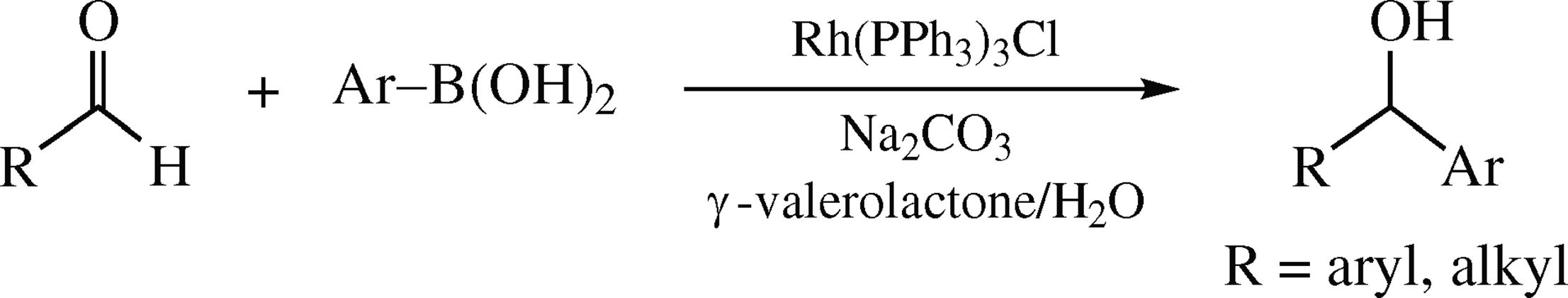 A simple rhodium-catalyzed addition reaction of aldehydes with arylboronic acids in aqueous γ-valerolactone provides the corresponding benzylic alcohols in moderate to good yields. Other organoboron reagents (boronic esters, aryl-trifluoroborates, etc.) also showed good compatibilities, albeit with relatively lower yields.
