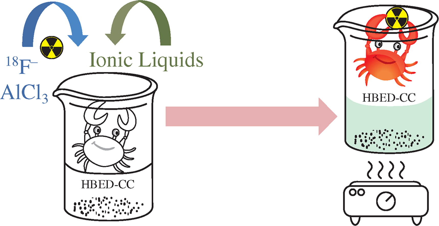 The possibility of Al18F-radiolabeling of molecules with the N,N'-bis[2-hydroxy-5-(2-carboxyethyl)benzyl]ethylenediamine-N, N'-diacetic acid motif in the medium of protic alkanolammonium ionic liquids is reported for the first time. Ionic liquids containing triethanolammonium or triisopropanolammonium cations proved to be the most promising. High values of radiochemical conversion were achieved using the minimum amount of the precursor.