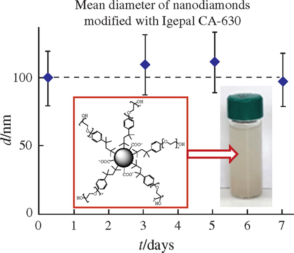 Nanodiamond dispersions in water and DMSO were stabilized with adsorbed layers of nonionic surfactant Igepal CA-630. Adsorption isotherms of Igepal CA-630 onto nanodiamonds from water and DMSO reveal the structure of the adsorbed layers. The stabilized aqueous dispersions retain their resistance to aggregation for at least 7 days, while the dispersions in DMSO are stable for 3 days.