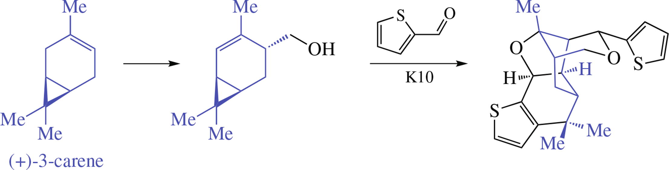 Reaction of trans-4-hydroxymethyl-2-carene with thiophene- 2-carbaldehyde under heterogeneous catalysis by K10 clay affordsubstitutedmethanopyrano[4,3-b]thieno[3,2-g]- benzofuran, a complex 5-membered chiral cage heterocyclic compound containing two thiophene moieties. Its structure was determined by 1D and 2D NMR experiments (HSQC, HMBC, COSY, NOESY) and HRMS.