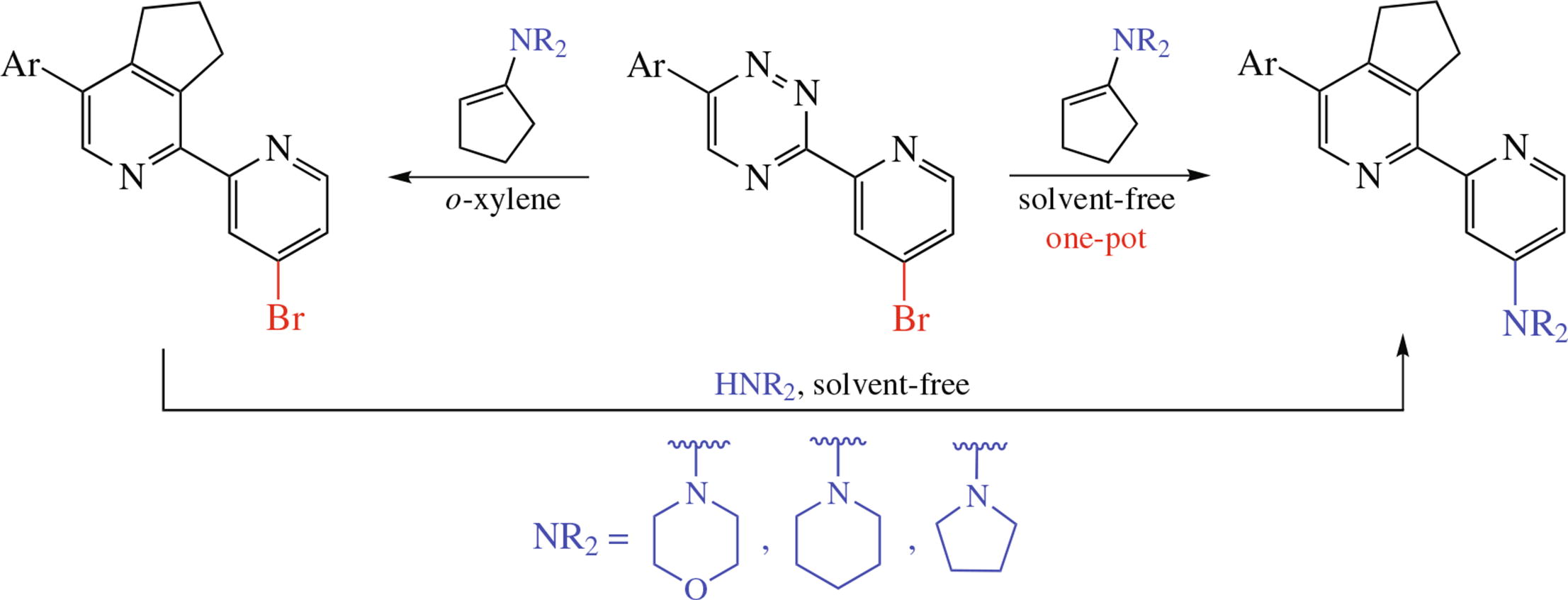 One-pot synthesis of cyclopentane-fused 5'-aryl-4- cycloalkylamino-2,2'-bipyridines based on the neat (200 °C) reaction of 3-(4-bromopyridin-2-yl)-1,2,4-triazines with enamines is reported. In the course of the transformation, consecutive aza-Diels–Alder reaction and nucleophilic substitution of bromine atom under the action of the liberating amine occur. The possibility of the solvent- and catalyst-free replacement of 4-positioned bromine atom in 2,2'-bipyridines by amino moieties was demonstrated.