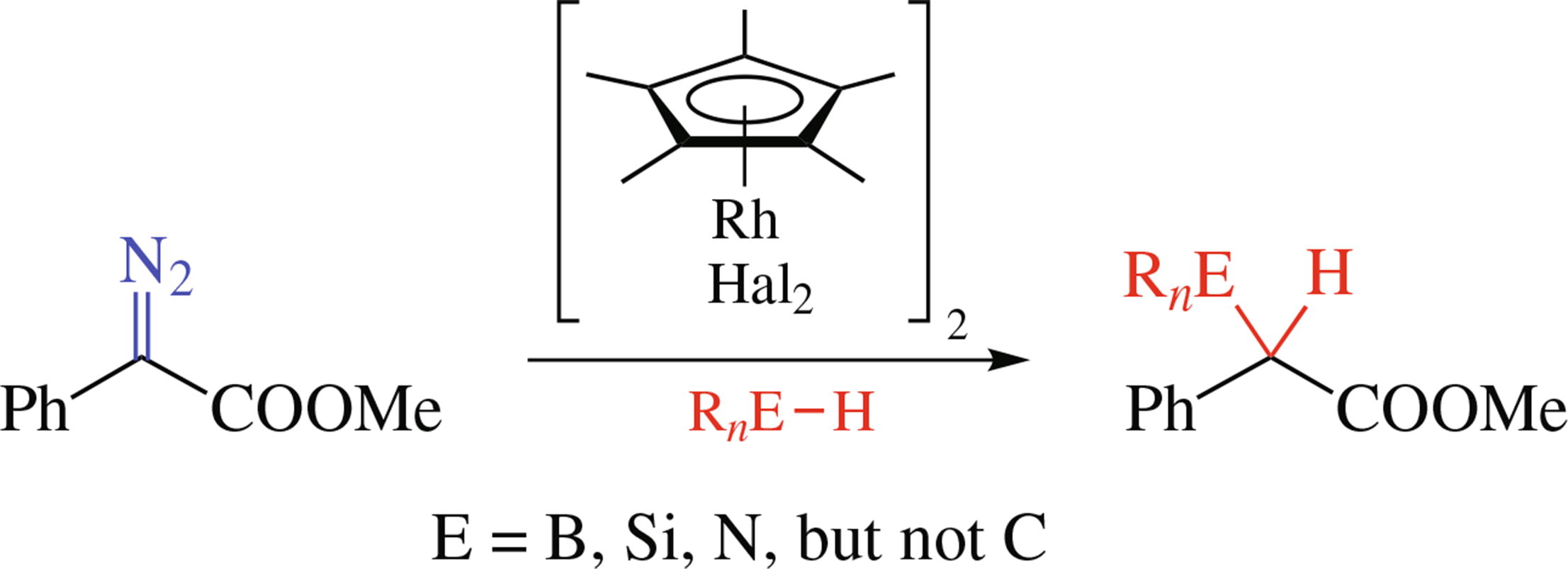 Rhodium(III) complexes catalyze the insertion of carbenoids generated from diazo compounds into E−H bonds (E = B, Si, N, but not C), although less efficiently than classical rhodium(II) carboxylates, despite formally higher oxidation state of the metal.