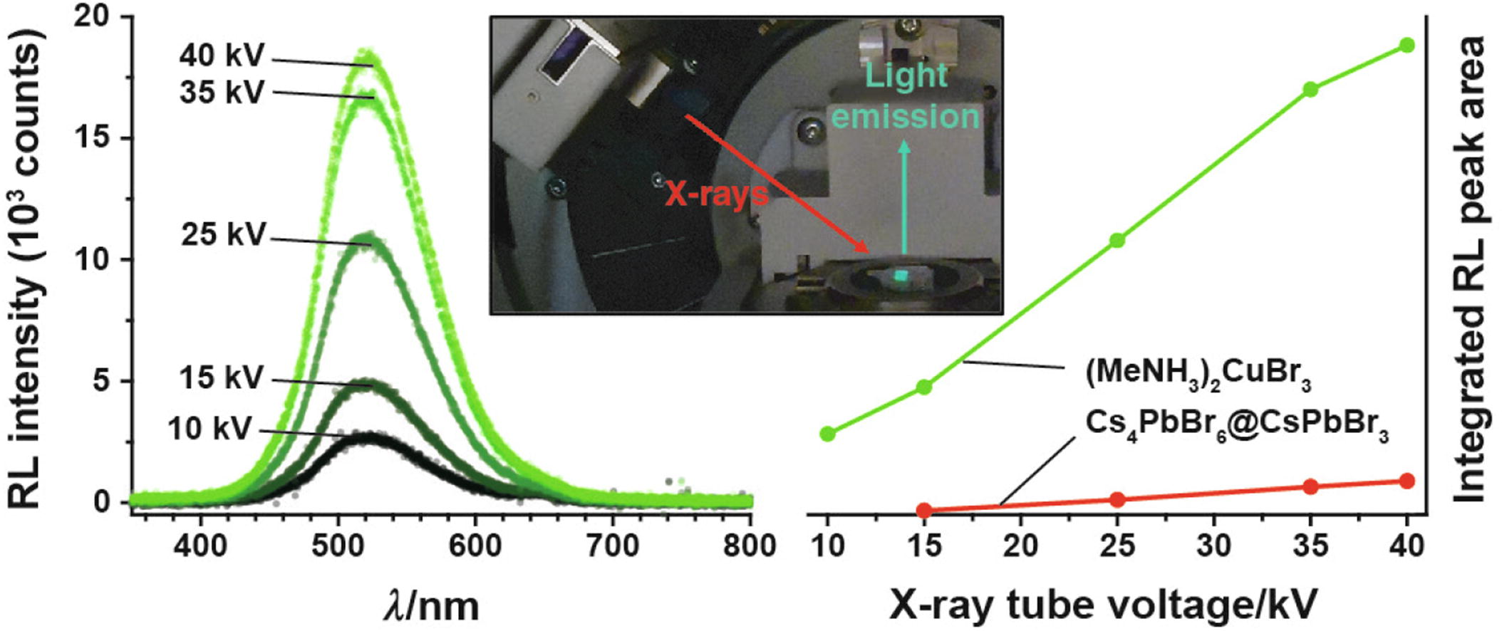 We report the radioluminescent properties of the recently discovered hybrid bromocuprate (MeNH3)2CuBr3 in a poly(methyl methacrylate) matrix in the form of solution- produced composite thick films. The obtained films demonstrate bright turquoise photoluminescence in UV light and intense radioluminescence due to CuKα and AgKα radiation at room temperature, exceeding the radioluminescence intensity of Cs4PbBr6@CsPbBr3 films by more than an order of magnitude.