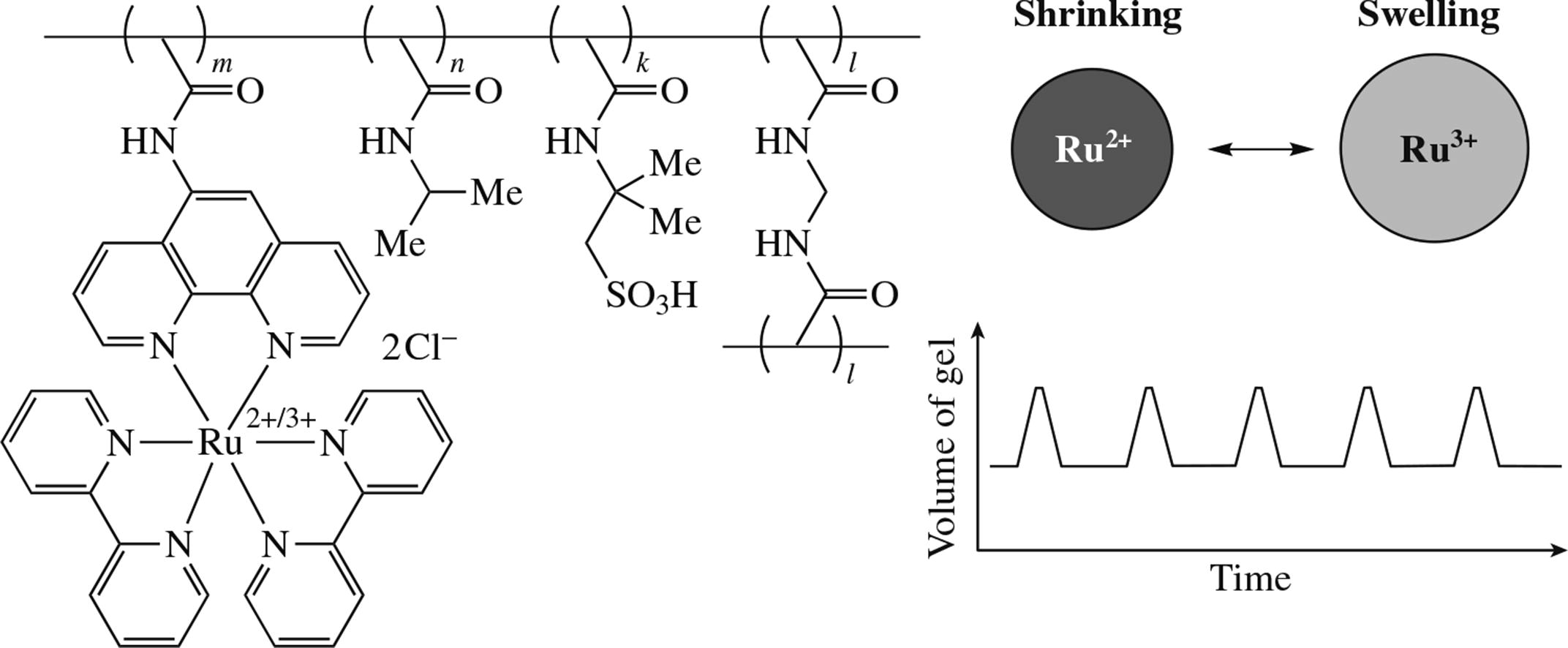 We report on the synthesis of new Ru(bpy)2(phen) catalyst for the oscillatory Belousov–Zhabotinsky chemical reaction and on the preparation of novel Ru(bpy)2(phen)-based self-oscillating gels. The synthesized gels exhibit high-amplitude autonomous mechanical oscillations when the Belousov–Zhabotinsky reaction proceeds inside these gels