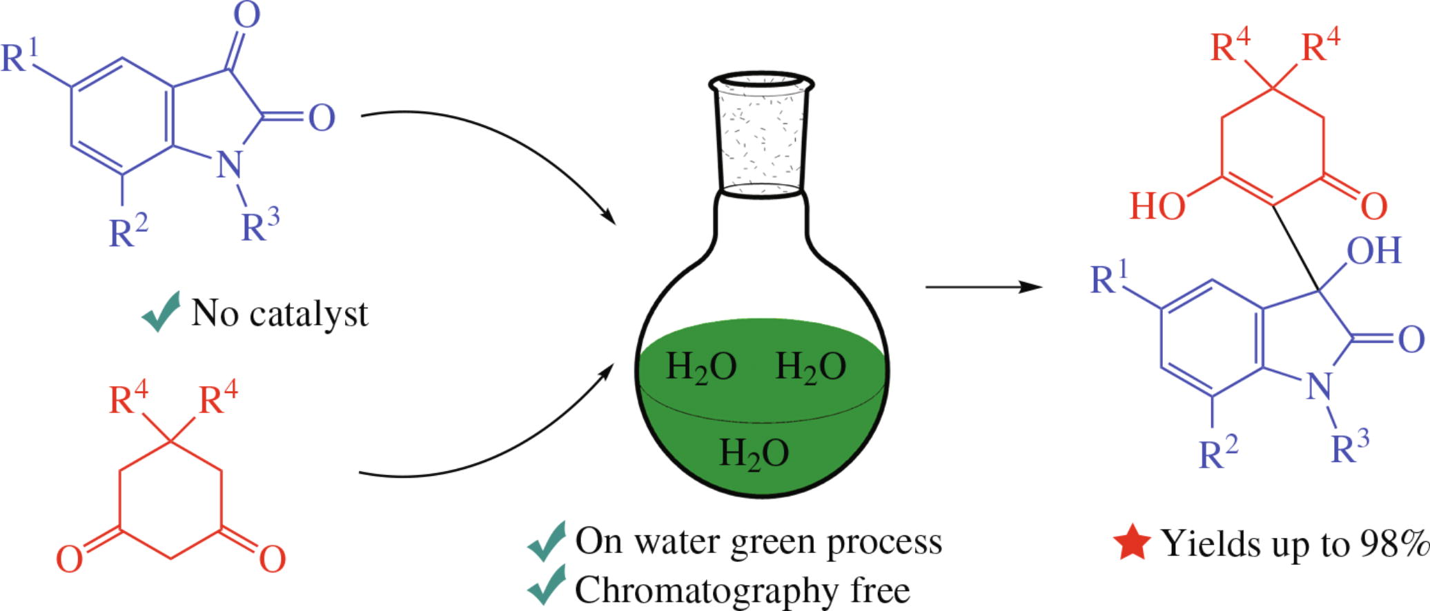 Noncatalytic on water aldol transformation of isatins and cyclic 1,3-diketones results in substituted 3-hydroxy-3-(2-hydroxy-6-oxocyclohex-1-en-1-yl)indolin-2-ones in 87–98% yields. Optimized conditions have been found and a mechanistic rationale for the reaction has been deduced. The new efficient and facile process represents a convenient way to compounds with the 3-hydroxyindolin-2-one and 3-hydroxycyclohex-2-en-1-one moieties.