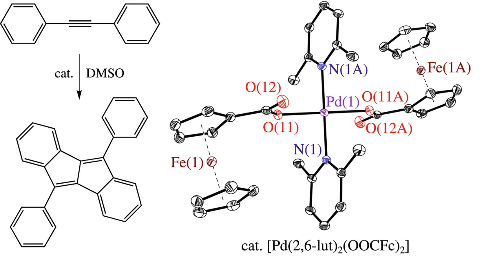 Novel highly soluble palladium-based complexes with ferrocenecarboxylic acid of general formula [Pd(lut)2(FcCOO)2] (lut is 2,6-or 3,4-lutidines) were synthesized and structurally characterized by single-crystal X-ray diffraction. The catalytic oxidation of 1,2-diphenyl-acetylene with these complexes gave dibenzo[a,e]pentalene derivative along with other products.