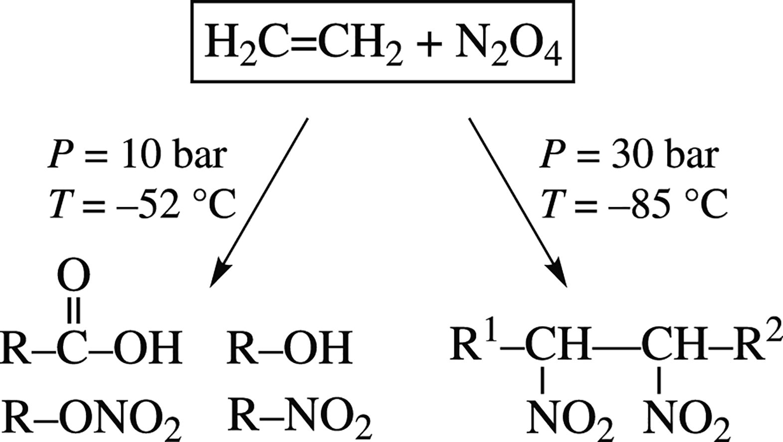 Calorimetric monitoring of the autoclave reaction N2O4 + C2H4 at –85 to +10 °C under argon pressure 10–30 bar revealed that the exothermic chemical reaction started at temperatures above –52 °C at 10 bar, whereas an intensive exothermic reaction started at –85 °C and pressure of 30 bar. IR study showed that oligo/polynitroethylene was formed at 30 bar, while carbonyl and hydroxy compound as well as nitrate R–ONO2 formation occurred upon processing at 10 bar.