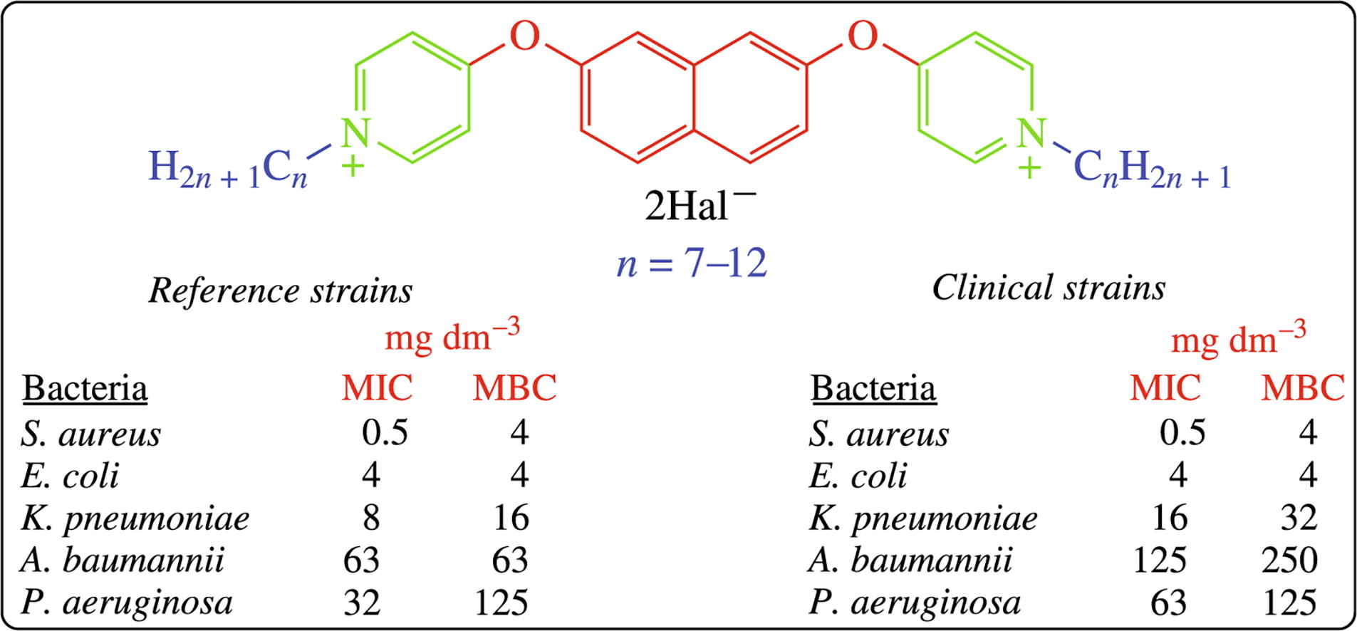 Novel para-substituted bis-pyridinium compounds containing 2,7-dioxynaphthalene spacer were synthesized in two simple steps from the corresponding dihydroxy-naphthalene. The microbiological study on five reference (E. coli ATCC 25922, K. pneumoniae ATCC 70060, S. aureus ATCC 43300, P. aeruginosa ATCC27853, and A. baumannii ATCC 15308) and five clinical (E. coli B-3421/19,K. pneumoniae B-2523/18, S. aureus B-8648, P. aeruginosa B-2099/18 and A. baumannii B-2926/18) bacterial strains showed promising range of antibacterial properties for these biocides, compared to modern sanitizers.