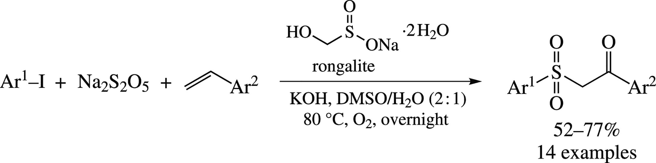 Direct arylsulfonylation of arylethenes with aryl iodides and sodium metabisulfite to access β-keto sulfones is described. In this reaction, rongalite (sodium hydroxymethanesulfinate) and sodium metabisulfite serve as the radical promoter and the sulfur dioxide surrogate, respectively.