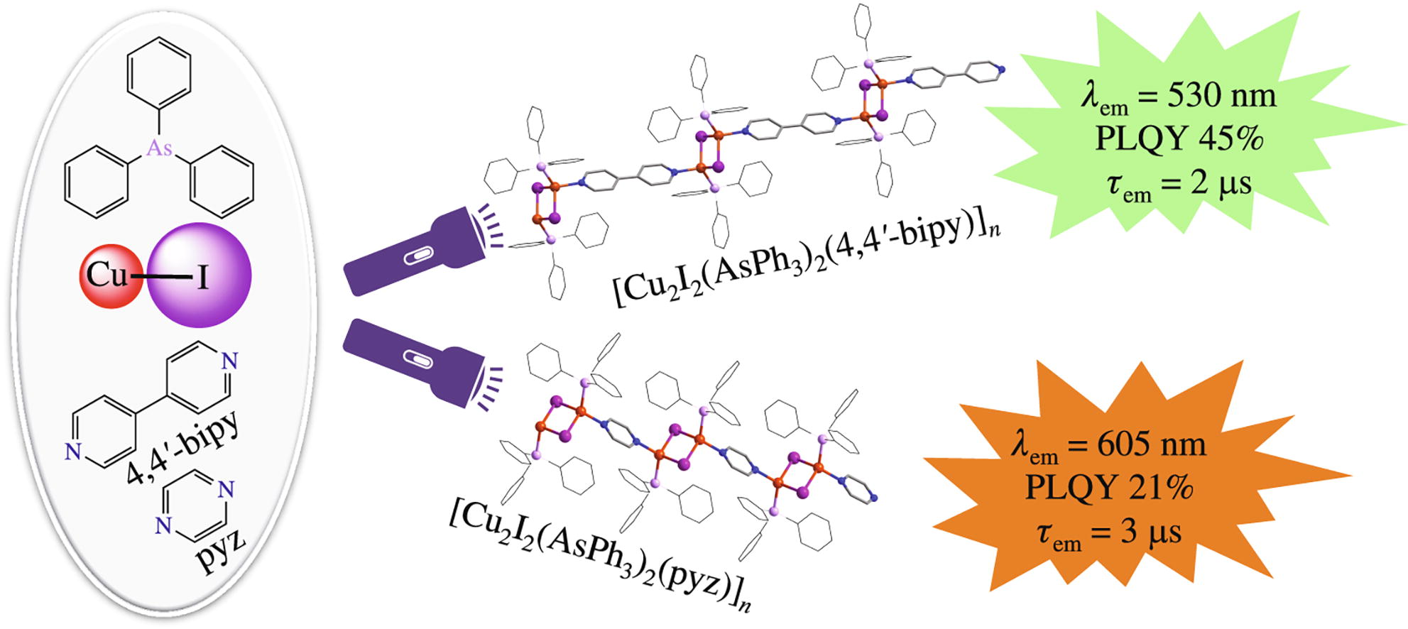 1D coordination polymers [Cu2I2(AsPh3)2(L)]n (L = 4,4'-bi-pyridine, pyrazine) were synthesized via the reaction of CuI with AsPh3 and N,N'-ditopic co-ligand s L. At ambient temperature, these polymers exhibit short-lived (2.3–3.2 μs) thermally activated delayed fluorescence (TADF) with max at 530 nm (L = 4,4'-bipyridine) and 605 nm (L = pyrazine) and quantum efficiency up to 45%.