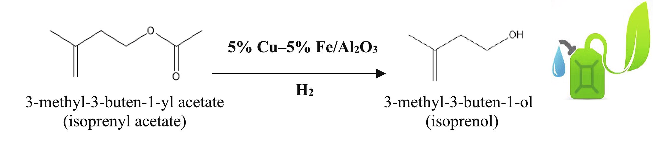 Supported bimetallic Cu–Fe catalysts revealed high activity and selectivity in isoprenyl acetate hydrogenation to isoprenol under mild reaction conditions (2 MPa H2 and 170 °C). The nature of the carrier has a significant impact on the catalytic properties of Cu–Fe catalysts. The best catalytic properties were found for the 5% Cu–5% Fe/Al2O3 bimetallic catalyst, which provides a 98% isoprenyl acetate conversion in 4 h with the isoprenol selectivity of 82%.