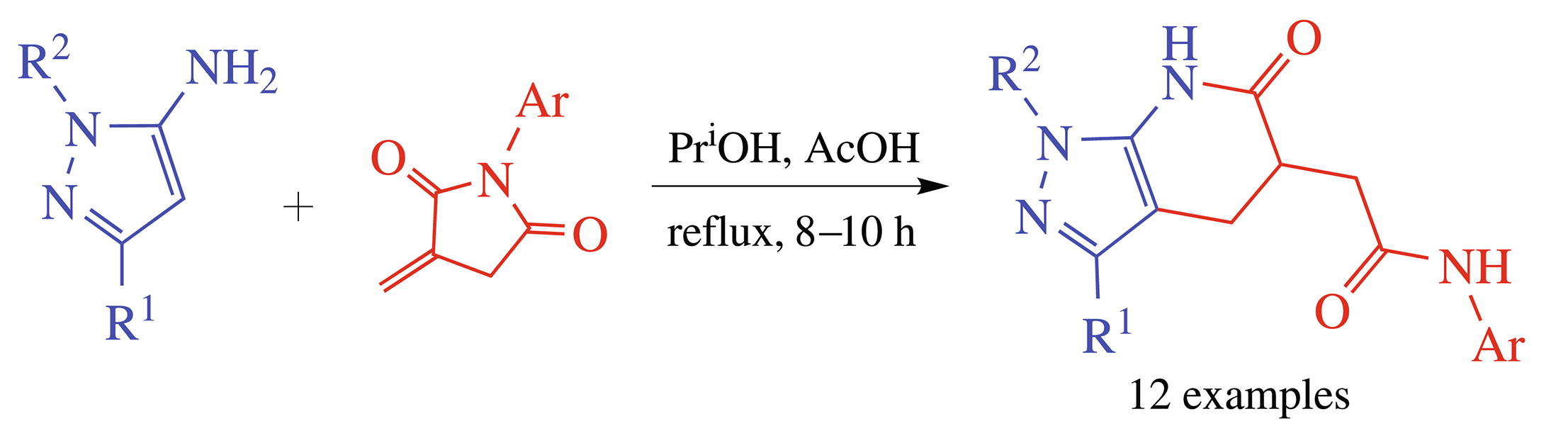 New polyfunctional hydrogenated pyrazolo[3,4-b]pyridines were obtained by the chemoselective reaction between N-arylitaconimides and 5-aminopyrazoles. The transformation is the cascade reaction including Michael addition at the active double bond of the itaconimide followed by the intramolecular transamidation and recyclization.