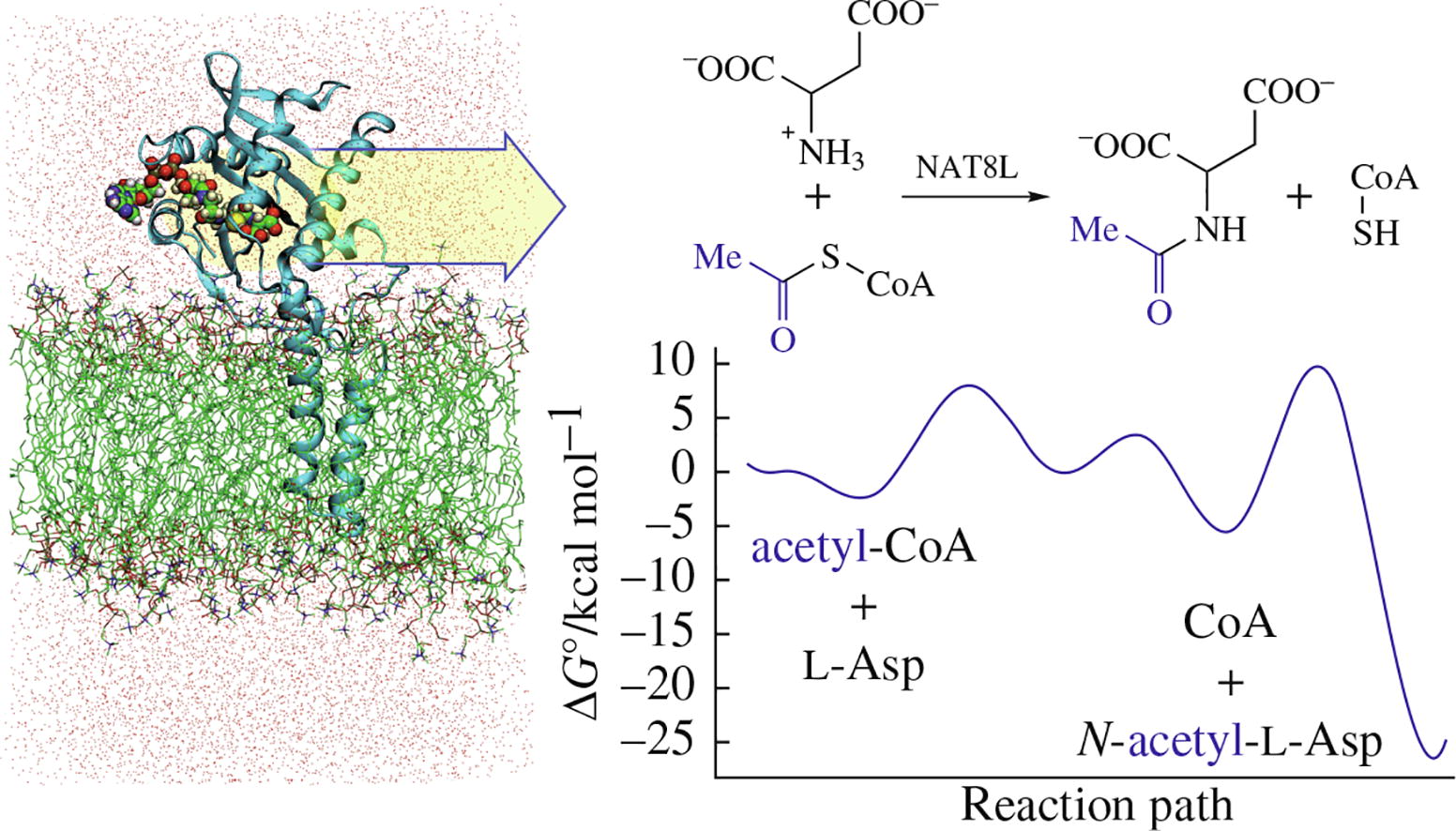 The results of a computational study of the synthesis of a key brain metabolite, N-acetyl-l-aspartate, catalyzed by aspartate N-acetyltransferase, encoded by the NAT8L gene, are reported. The reaction Gibbs energy profiles were computed using molecular dynamics simulations with interaction potentials estimated on-the-fly by the quantum mechanics/molecular mechanics QM(PBE0/6-31G**)/MM(CHARMM) approach. The revealed reaction mechanism includes four elementary steps with corresponding activation energies not exceeding 14 kcal mol−1