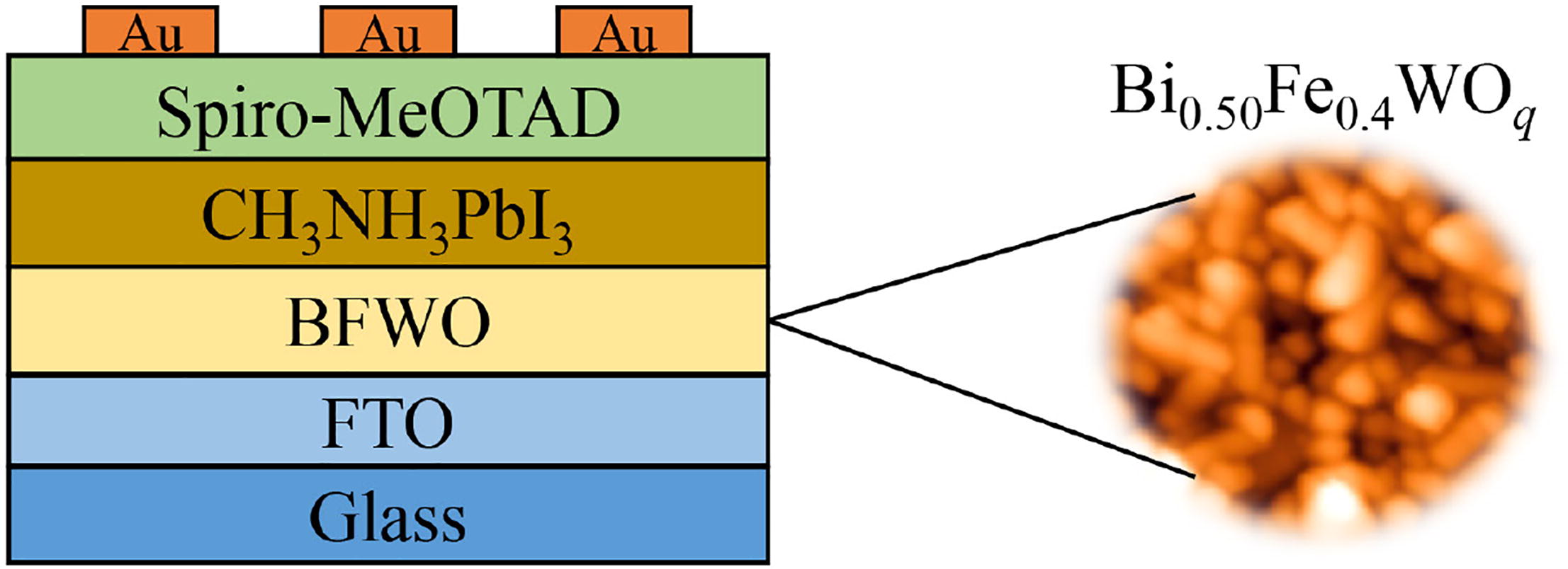 Thin films based on the ternary complex oxide Bi0.50Fe0.4WOq with a cubic pyrochlore structure were obtained and used for the first time as electron-transport layers in perovskite solar cells. The measured power conversion efficiency was ∼ 4 rel% higher than that of state-of-the-art TiO2-based perovskite solar cells.